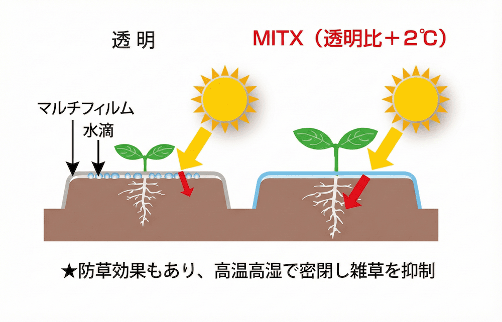 MITXはマルチ内側に水滴がつきにくく、熱エネルギーを奪われない為、地温が上昇しやすい。